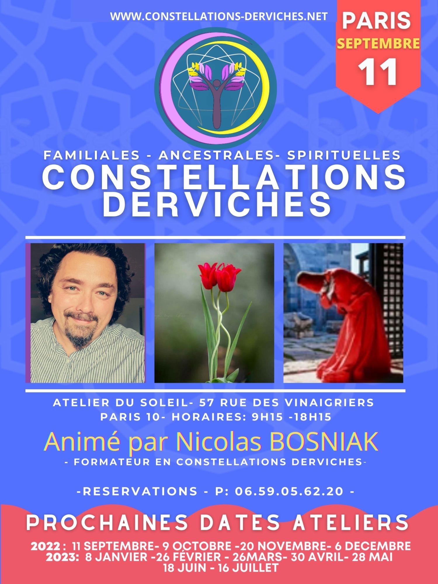 Un entretien préparatoire d’une heure à lieu 7 à 10 jours avant votre constellation en cabinet ou en téléconsultation. Cet entretien permet avant tout de clarifier la problématique, de construire votre arbre généalogique et le plus essentiel, définir le(s) résultats que vous attendez des suites de cette constellation. Ensuite le constellateur derviche vous invite à faire chez vous un petit travail intérieur spécifique en journée et en soirée jusqu’au jour de votre constellation, en lien avec l’âme de la famille et de vos ancêtres.
